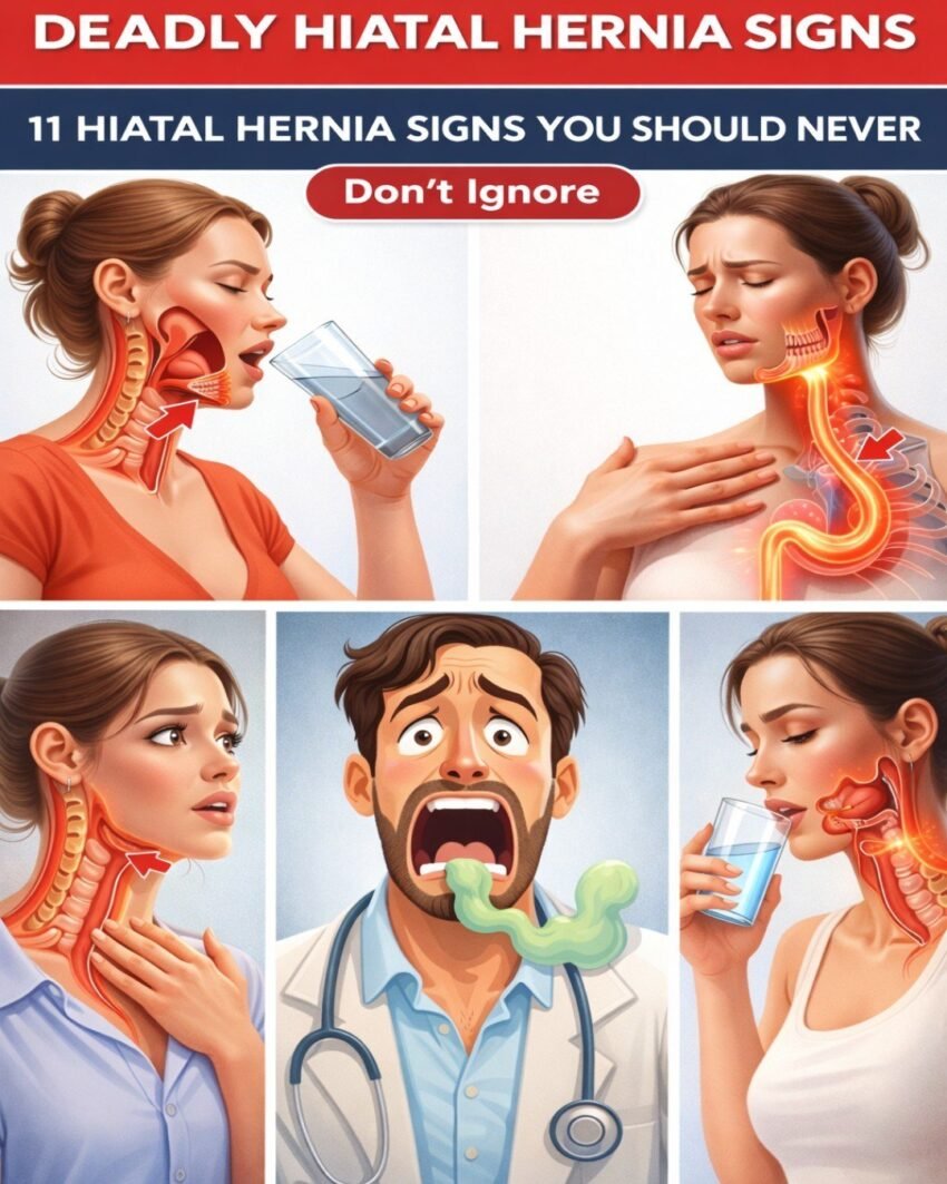 A hiatal hernia happens when part of the stomach pushes up through the diaphragm into the chest area. Many people have it without realizing it.Hiatal Hernia symptoms are often related to acid reflux and digestion.Here are 10 signs and symptoms you should know: