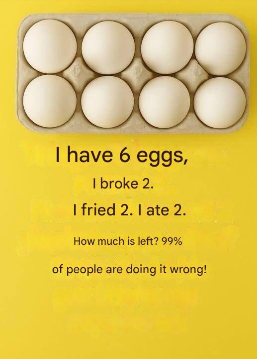 “You have 6 eggs. You break 2, you fry 2, and you eat 2. How many eggs are left?”