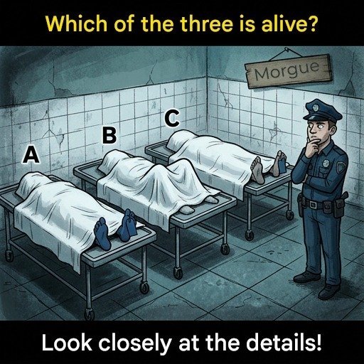 Visual puzzles challenge your observation skills by hiding small but important clues in plain sight. In this puzzle, you are shown a scene inside a morgue with three covered bodies labeled A, B, and C. The question is simple: Which one is still alive?